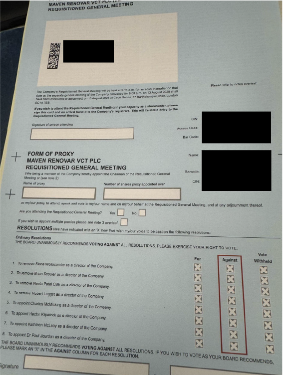 Shareholders have not been presented with anything out of keeping with investment trust proxy voting precedent, according to the board of Maven Renovar VCT, amid claims from the requisitioning party that the board has put an unfair or even unlawful document to its clients.